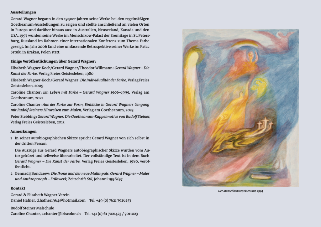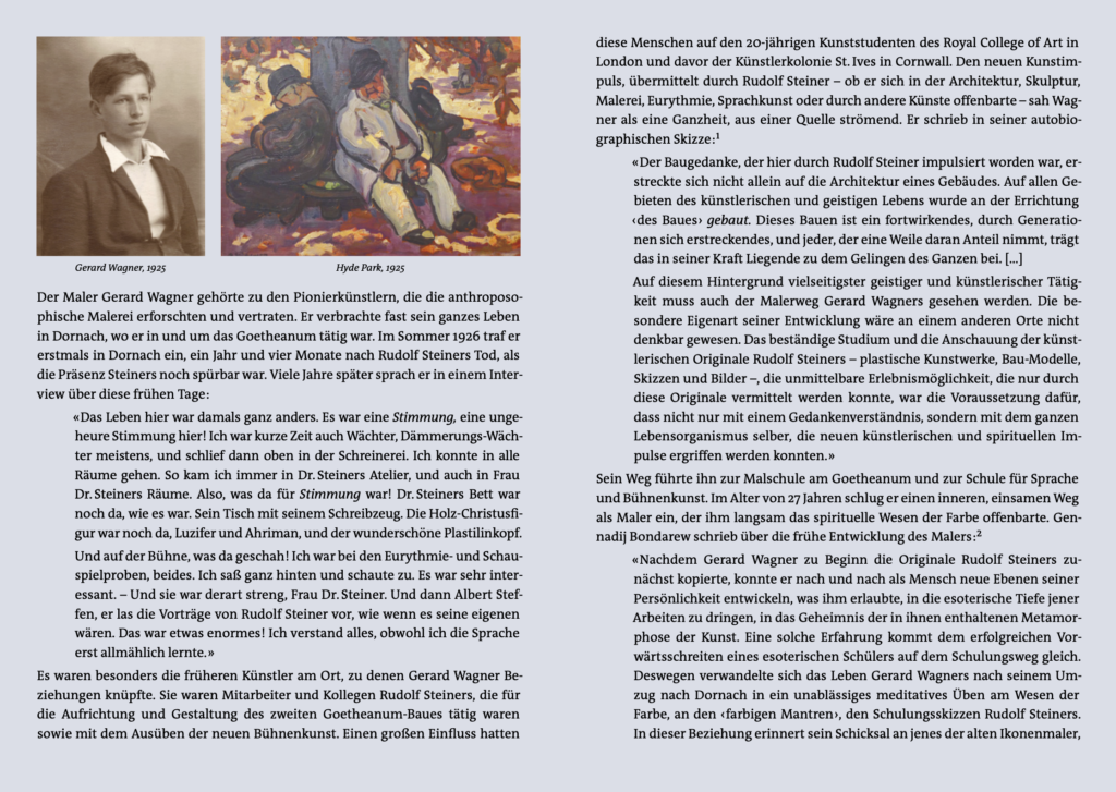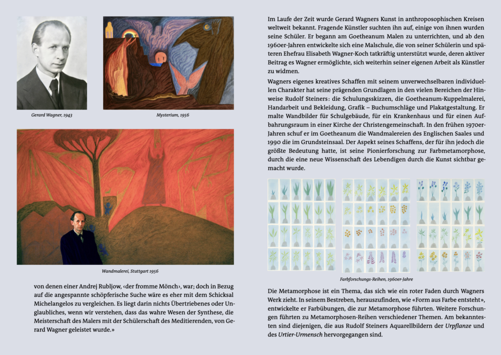 GERARD WAGNER 1906-1999. EIN LEBEN MIT FARBE, 2021, Verlag am Goetheanum. Diese umfangreiche Biographie des Malers Gerard Wagner enthält eine Fülle von Fotos und Gemälden. Sie enthält auch Hinweise von Rudolf Steiners auf einen neuen Malimpuls.